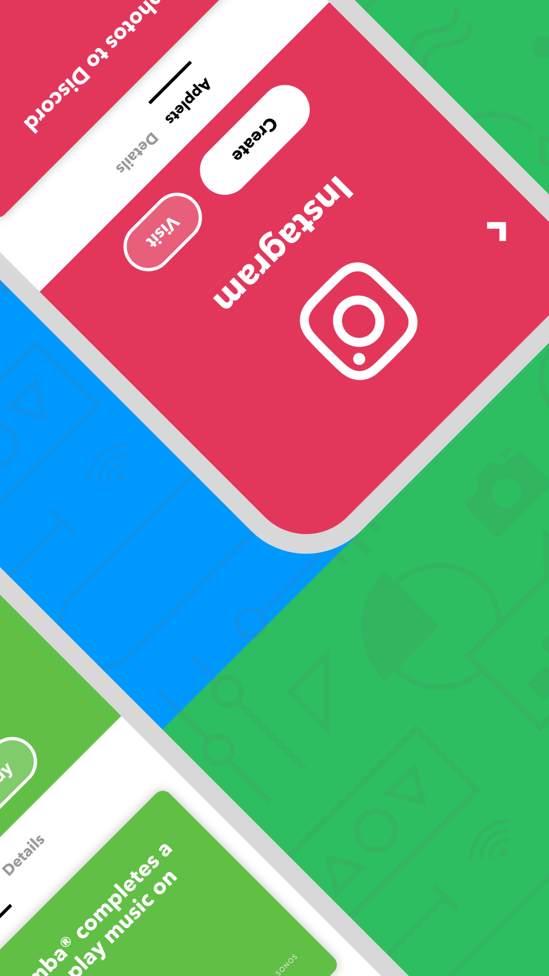 Applets reúne tus servicios favoritos para crear nuevas experiencias.Más de 630 aplicaciones funcionan con IFTTT, incluyendo Twitter, Telegram, Google Drive, Twitch, Weather Underground, Instagram, Gmail, el correo electrónico y dispositivos como Amazon Alexa, Google Home, Sonos, Philips Hue y tu Android.